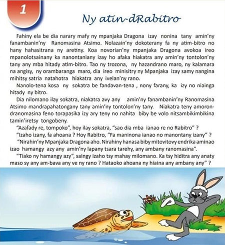 韓國駐馬達加斯加大使館去年12月30日(當地時間)表示:“從新年開始,將示範性地向位於馬達加斯加首都地區和部分地方城市的小學發放《韓國和馬達加斯加傳統童話和文化》教科書。”該教科書中包括了翻譯成當地語言馬爾加什語的《興夫與孬夫》、《黃豆鼠和紅豆鼠》、《龜主簿傳》等10部韓國代表性童話。還包括了韓文、韓國飲食、韓國經濟發展•歷史等內容。