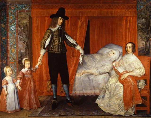 17世紀英國畫家大衛·德·格朗珠畫的這幅畫中,模特是英國貴族理查德·索爾頓斯托爾的家人。紅色的床簾和服裝、華麗的室內裝飾體現了這個家族的富足和高貴身份。乍壹看,好像講述的是丈夫和孩子們壹起來看剛生育的妻子的場面,但實際上卻恰恰相反。躺在床上的女子是索爾頓斯托爾的第壹任妻子,是左邊兩個孩子的母親。坐在椅子上的女性是第二位妻子,抱著自己所生的兒子。但是,索爾頓斯托爾並沒有在同壹個屋檐下帶著兩個妻子生活。