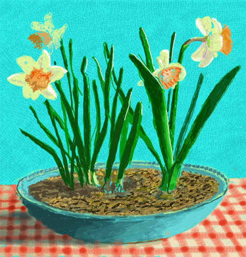 在iPad 繪畫作品中,黃色水仙花盛開。因看不到沈寂跡象的病毒氣焰,全球人們的不安感也在加大。即便如此,病毒也無法阻止春天的到來。這是英國畫家大衛•霍克尼(83歲)最近在丹麥路易斯安那現代藝術博物館的社交網絡服務(SNS)上公開的一幅畫。