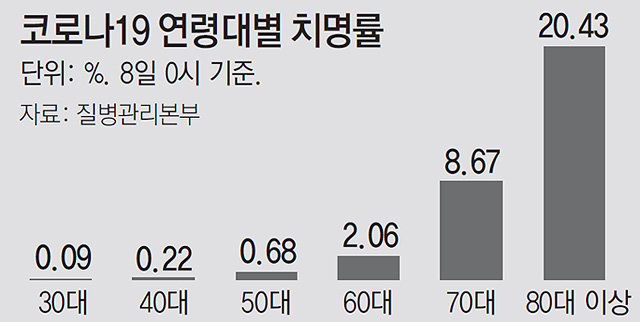 8日,韓國新科冠病毒感染死亡人數達到200人。距離韓國國內出現首例確診新冠病例79天、出現死亡病例49天。截至當天的病亡率為1.93%,80歲以上高齡者的病亡率為20.43%。特別是,80歲以上男性確診患者(147人)中,死亡者占25.9%(38人),呈現出他們是新冠病毒最為脆弱的群體。