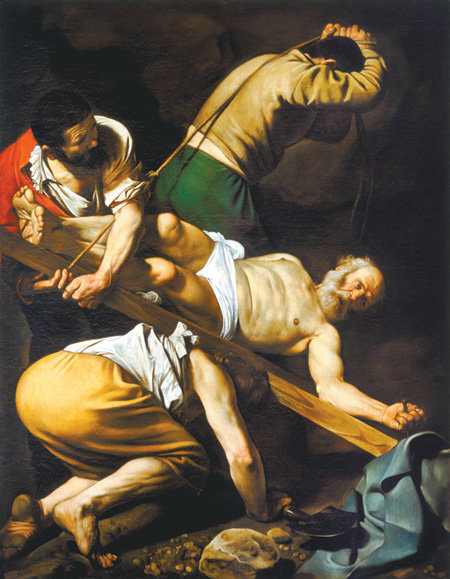 17世紀意大利畫家卡拉瓦喬在畫幅上生動地記錄了彼得殉教的場面。畫家將首任教皇的彼得描寫為“赤裸而痛苦的老邁者”,而不是“偉大的聖人”。畫中的彼得幾乎赤身裸體地倒掛在十字架上。因為他主動請求,不敢以與老師相同的方式死,要倒著釘。他擡起頭想看看什麽,扭動著身子試圖站起來,但只會增加痛苦,動彈不得。滿是深邃皺紋的臉上充滿著痛苦,凝視遠方的悲傷眼神似乎熱切盼望救援。畫面中間下方的壹塊大石頭表達著耶穌“將在這塊磐石上建立我的教堂”的話,象征著彼得。