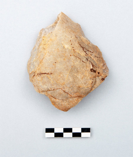 石器是在村南的丘陵一帶確認的,其中石鏟(照片•上端鋒利,越往下越寬的形狀的工具)是菱形的,是用從大石頭上弄下來的石雕制成的。兩側邊緣刀刃部分有些殘損形成了對稱。另外一件看起來像是石斧(給除去碎石或是有棱角的石頭的邊緣的刀刃開光的石器)一類的破片。