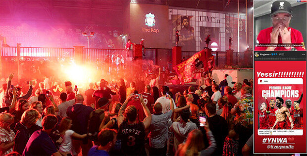 在確定奪冠的那一刻,球迷們不顧主教練克洛普的叮囑,聚集在主場利物浦安菲爾德,揮舞旗幟,燃放鞭炮。擁有利物浦2%股份的美國職業籃球(NBA)巨星勒布朗•詹姆斯也表示:“我們是冠軍。Let's go”,並上傳到SNS,盡情享受球隊奪冠的喜悅。