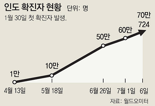 在人口超過13億的印度,新冠疫情的擴散勢頭迅猛。據國際統計網站“世界實時統計”統計,6日印度累計確診患者為698817人,僅壹個月(6月6日為226622人)就增加到2.8倍。據統計,死亡人數為19703人。確診患者規模繼美國(2982928名)和巴西(1604585名)之後,位居世界第三。