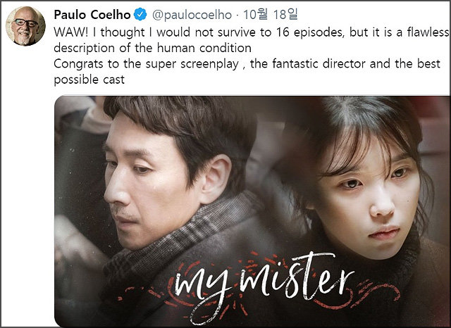 世界暢銷書作家保羅•科埃略(73歲•小照片)18日(當地時間)在自己的推特上上傳韓國電視劇《我的大叔》的劇照,並寫下了如上文字。該推特以19日為準,轉發6400次,被引用4700次以上。該帖子下面有這樣的評論,“最佳電視劇”“是我最喜歡的電視劇”等。
