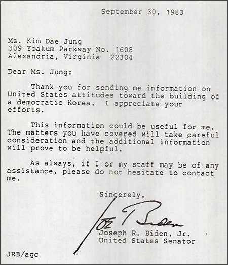 拜登當選人1983年9月寫了壹封信,信中寫道:“感謝您提供美國對韓國民主化態度的情報。對此表示感謝。”據悉,1982年12月至1985年2月在美國流亡的金前總統壹直向美國主要人士發送以韓國的民主化和美國對外政策等為主題的演講稿等。拜登當選人的信是對此的回信。