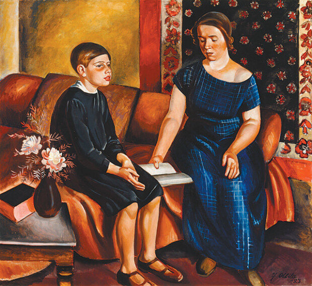 奧裏拉1887年出生於赫爾辛基,擅長繪畫、設計、壁畫等多種領域。他作為公費獎學金獲得者前往法國學習印象主義,回國後創立了芬蘭印象主義集團。但由於主導設立劇場後破產,1920年與家人壹起再次前往巴黎。為了養家糊口,他從事舞臺布景和壁紙設計工作,同事兼畫家和妻子莉莉則從事假花和葬禮花圈的制作。這幅畫就是那個時期畫的。畫中的模特兒看起來是畫家的妻子和兒子。當時兒子正在上法國小學。作為外國家庭的子女,讀法語比讀朋友要困難得多,而且要給孩子看作業的媽媽也有很多苦衷。