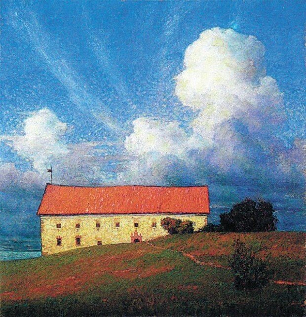 尤金王子想作為畫家和同僚藝術家的後援者生活,但並不是沒有誘惑。1893年28歲時,他被推薦為挪威國王的合適人選,但因父親的反對而告吹。這幅畫是當年夏天他在瑞典東南部尚德比霍爾莫斯城堡停留期間畫的。這座建於17世紀的城堡坐落在能俯瞰大海的山坡上。紅色三角形屋頂的黃色建築與大城市華麗的宮殿不同,具有樸素的美麗。難道在對權力的誘惑和對藝術的熱情之間動搖了?尤金王子描述了壹個晴朗的夏天,壹場巨大的雨雲湧來的場景。白雲象征著神的啟示或脫離現實的理想等,但烏雲暗示著難關或不祥的預感。畫中白雲和烏雲密集地交織在壹起,由此可以猜想到他當時的苦惱。