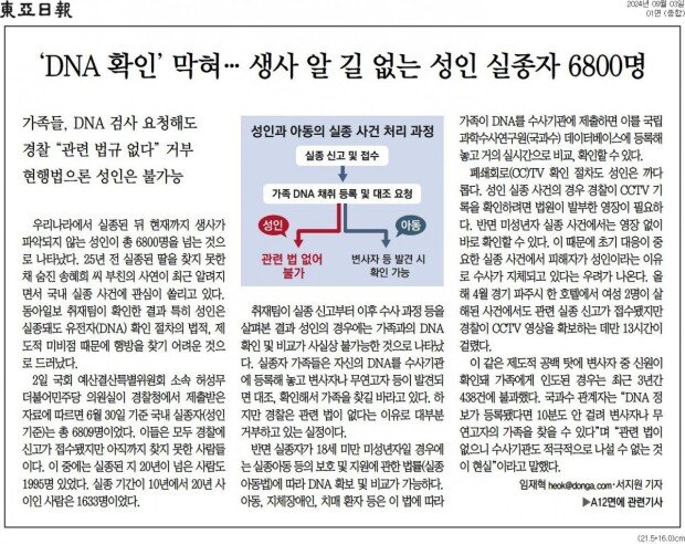 성인 실종자 수사가 더딘 이유는 현행법상 경찰이 실종자 가족의 DNA를 활용해 실종자를 찾을 법적 근거가 없기 때문이다. 실종 아동 등의 보호 및 지원에 관한 법률에 따르면 실종자가 18세 미만 미성년자의 경우엔 가족이 DNA를 수사기관에 제출하면 국립과학수사연구원 데이터베이스에 등록해 놓고 실시간으로 비교, 확인할 수 있다.