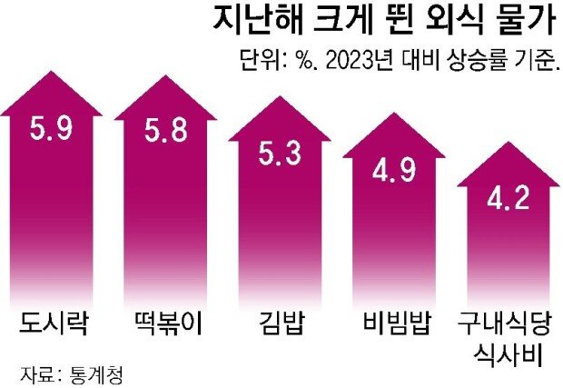 13日,據統計廳統計,去年餐飲物價比前壹年上升了3.1%。這壹數值高於整體物價上漲率(2.3%),餐飲物價從2022年開始連續3年保持3%以上的上漲率。特別是以代表性的平民餐飲品種為中心,上升趨勢仍在持續。炒年糕的價格上漲了5.8%,漢堡包(5.4%)、紫菜包飯(5.3%)、炸雞(4.8%)等的價格也大幅上漲。性價比高的壹頓飯,上班族經常光顧的便當(5.9%)和內部食堂(4.2%)的價格暴漲,增加了負擔。