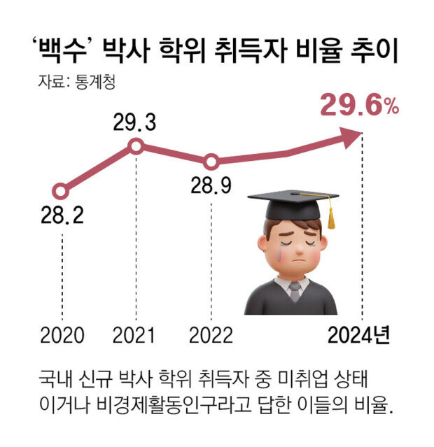 據調查,去年獲得博士學位的10人中有3人處於“無業”狀態。未滿30歲的博士中,近壹半沒有找到工作或甚至沒有進行求職活動。即使獲得了博士學位,壹半左右的年薪也不到6000萬韓元。