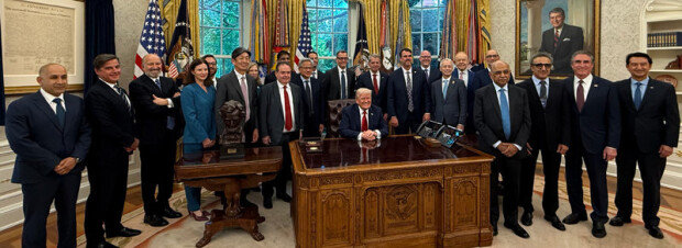도널드 트럼프 미국 대통령이 지난달 30일(현지 시간) 현대자동차, 일본 소프트뱅크와 도요타자동차, 미국 엔비디아 존슨앤드존슨 제너럴일렉트릭(GE) 등 미국 투자 계획을 밝힌 글로벌 기업 경영자 20여 명을 워싱턴 백악관으로 초청했다. 이들의 투자 결정을 호평하며 자신의 관세 정책이 성공하고 있다는 증거라고 주장했다.