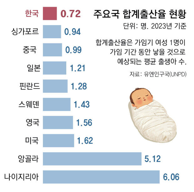 全球生育率從1960年代的5人以上減少到2023年的2.25人。據調查,目前世界人口約三分之二生活在出生率低於替代出生率的地區。以2023年爲基準,韓國的出生率爲0.72人,是壓倒性的倒數第一。低出生率嚴重威脅着國家的可持續性。