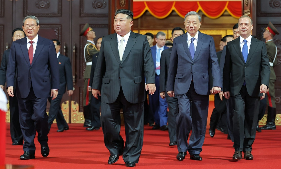 朝鮮10日下午舉行盛大閱兵,慶祝勞動黨成立80週年。朝鮮國務委員長金正恩與中國權力排名第二的國務院總理李強和俄羅斯總統普京的親信、俄羅斯國家安全會議副主席梅德韋傑夫一起登上金日成廣場主席臺,觀看了朝鮮針對韓國、美國和日本的最新武器隊列。金正恩前一天在慶祝大會上發表講話時強調反美聯合,主張“共和國的國際權威日益加強”。他是在明確表示,即使美國總統特朗普提議進行對話,朝鮮也不會脫離朝中俄聯合的軌道。